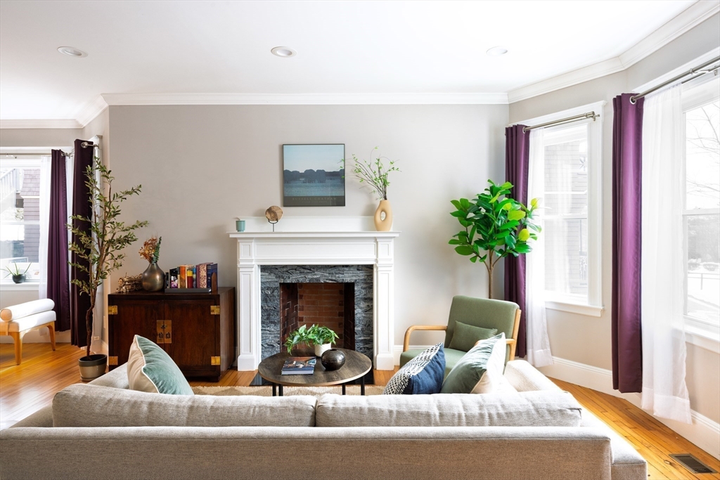 Nestled on a lovely tree-lined block in one of Watertown's most beautiful and convenient neighborhoods, this exquisite condo offers the perfect balance of modern luxury and timeless charm. Renovated to the studs in 2020 with high ceilings, hardwood floors, and upscale finishes, this property offers a fabulous bi-level layout with an expansive open-concept main level. The luminous living room opens to the dining area and a spectacular kitchen with white cabinetry, stainless appliances, stone countertops, and plenty of storage. There are two generous bedrooms on this level and an elegant full bath. The lower level offers a sumptuous primary suite with a walk-in closet and a luxe full bath replete with rainfall showerhead, glass door, and a double sink. Private laundry room, xtra 1/2 bath and storage including a bonus room. Fabulous fenced backyard and exclusive-use patio. Two off-street parking spaces. Premier location near Watertown Center, Arsenal Yards, shops, dining, and schools.
